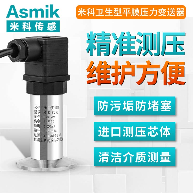 MIK-P350系列平面膜結構壓力變送器選用德國進口擴散硅芯體,采用平面膜直接感受壓力。傳感器接口有卡箍式,M27×2,法蘭式可供選擇。輸出信號有電壓、電流、頻率信號等可選擇,傳感器平膜片防止了結垢,不衛生及粘稠液體堵塞等問題。廣泛應用于食品、醫藥、衛生及釀酒工業等部門。